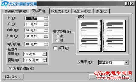 1.页面设置。一篇文字资料输入完毕后,通过选择Word选单中文件选单下的页面设置选项,设置纸张大小,如这里选择的是b5纸,在字符数/行数页框中,选择每一页打印的行数和每行要打印的字数。在页边距页框中的设置决定着能否进行双面打印,在这里主要对页边距中的上、下、内侧、外侧、装订线等值进行设置,在这里笔者设置该页面的内侧、外侧值都为20毫米,同时设置装订线的值为10毫米,选择对称页边距,这样双面打印的页面设置完毕,设置结果如图所示。