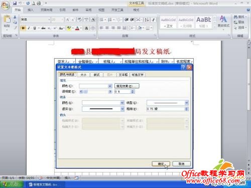第二步:新建一空白文档,切换“插入”选项卡,在“文本框”的下拉列表中选择“绘制文本框”,拖动鼠标勾勒出一文本框(用来设计文首的“XX县XXX局发文稿纸”字样),在文本框输入“XX县XXX局发文稿纸”,并调整字体、字号大小、颜色并将该行文字居中(务必调整好文字大小,因为将其剪切到发文稿纸中就无法调整字号大小),然后选中该文本框,将其剪切到第一步生成的发文稿纸中,在稿纸第一行第一个空格处进行粘贴,然后拖动、平移、调整文本框直至其左右端线与发文稿纸左右边界重合、上端线与发文稿纸最上端水平线重合,下端线与稿纸的第三条水平线重合(调整后如果文字没有显示居中,还可以在文本框中用空格键将文字移动居中),再右击文本框选择“设置文本框格式”,在弹出的对话框中切换到“颜色与线条”选项卡,将“填充”下的“透明度”滑杠拉到最左端,即设置透明度为0%(图4,此为关键点,务必留意!如果不设置透明度为0%,则眉首区、说明区、标题区的背景就会呈现单元格,而将透明度设置为完全不透明,就可以完全遮罩底层的单元格),再设置“线条”颜色为无色(如果之前的文本框的边界无法调整到刚好与水平线或边界重合,这里可适当调整线条“粗细”,使之完全遮盖方格线);