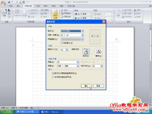 第一步:运行Word 2007,切换“页面布局”选项卡,点击“稿纸设置”,弹出“稿纸设置”对话框,选择“方格式稿纸”格式,“行数X列数”选择“20 X 20”格式,并将“网格颜色”设置为灰色,并勾选“按中文习惯控制首尾字符”(如果不选中该项,标点符号有可能会出现在行首,不符合行文要求),取消“允许标点溢出边界”选项的对勾,选择纸张幅面为16开或A4型,页脚选择“行数x列数=格数”,“对齐方式”选择“右”,其余按照默认设置“确认”后生成方格稿纸(图3);