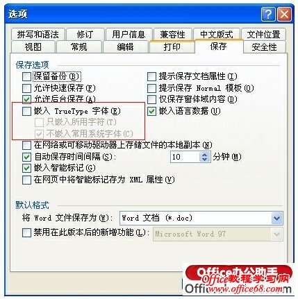 方法一:打开word选项中的【保存】选项卡,我们可以看到里面有潜入TrueType字体一项,勾选后单击【确定】即可,这样我们就可以直接把钢筋符号字体和word一起保存了。