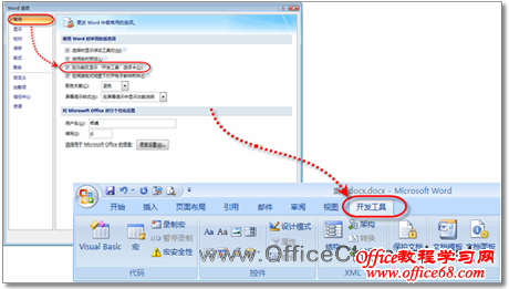 图5 单击下拉菜单中的【word选项】 (2)在随即打开的“Word选项”对话框中,单击左侧导航栏中的【常用】按钮,在“使用Word时采用的首选项”区域中,选中“在功能区显示‘开发工具’选项卡”复选框,单击【确定】按钮,此时“开发工具”选项卡已经被添加到功能区,如图6所示。