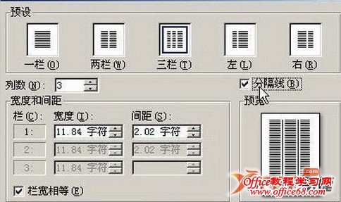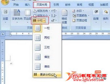 2、打开分栏设置窗口,操作同Word2003分栏。
