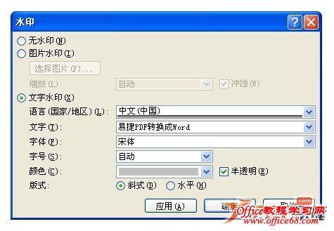 3、选择文字水印,设置水印文字的语言、文字内容、字体、字号、颜色、是否透明和版式,之后确定;