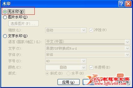 方法一:打开水印设置对话框,选择无水印,确定,就可以了,一般的水印通过这种方法都可以去掉。