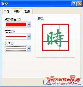 8、书法—选项—网格,设置字帖网格的线条颜色、边框和内线的样式,为了让大家看出效果,我们设置了红色、最粗边框和实心内线;