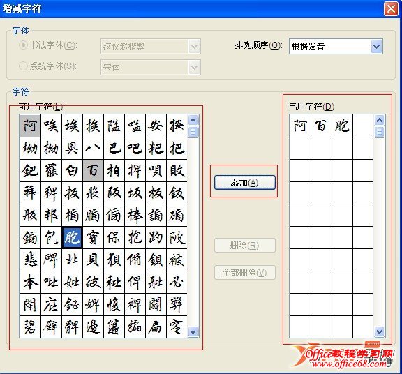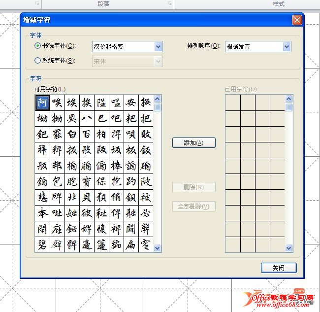 3、在增减字符对话框的左侧选择要加入字帖的汉字,点击中间的添加,我们会看到自己所选的汉字出现在右侧的已选字符中,已选字符处是此时Word文档的页面预览缩略图;