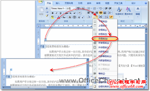 选中页眉中的段落标记,然后在“开始”选项卡的段落选项组中,单击【边框】按钮右侧的下三角按钮,在随即打开的下拉列表中执行【无框线】命令,即可彻底删除页眉中的横线,如图4所示。