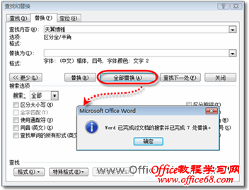 图4 “替换字体”对话框 (5)单击【确定】按钮,返回到“查找和替换”对话框,单击【全部替换】按钮,在弹出的提示对话框中可以看到替换完成的字体个数,单击【确定】按钮,此时所有要替换的文字,就一次性全部被替换为所需要的字体了,如图5所示,替换后的文字效果如图6所示。