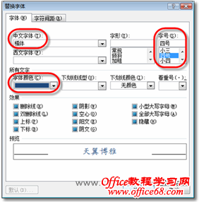 图3 执行【字体】命令 (4)在随即打开的“替换字体”对话框中,设置“中文字体”为“楷体”,“字号”为“四号”,“字体颜色”为“深蓝 文字2”,此时可以在“预览”选项区域预览设置后的字体效果,如图4所示。
