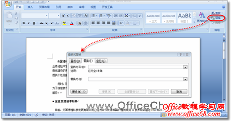 图1 打开“查找和替换”对话框 (2)在“替换”选项卡的“查找内容”文本框中输入“天翼博雅”,然后将光标定位至“替换为”文本框中,如图2所示。