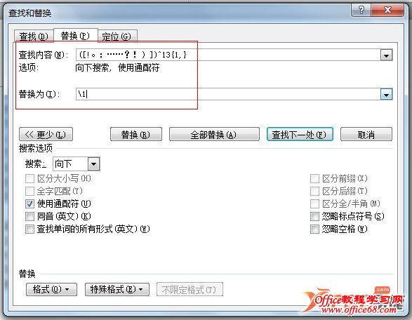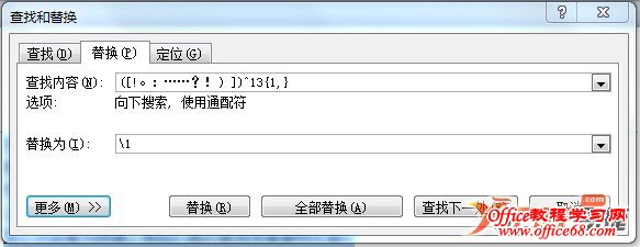3、在查找内容处输入([!。:……?!)])^13{1,},在替换为处输入\1,单击全部替换;
