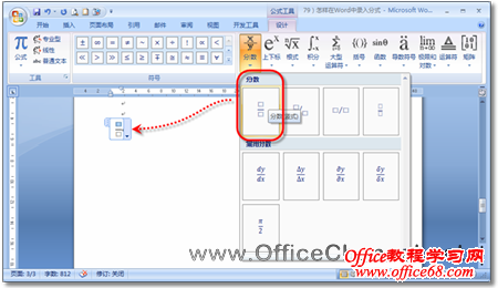 3)在“设计”上下文选项卡的“结构”选项组中,单击【分数】按钮,在随即打开的下拉列表中选择“分数(竖式)”,如图3所示。