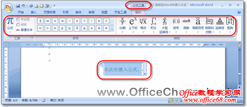 2)此时,标题栏中会显示“公式工具”标签,并在该标签下显示“设计”上下文选项卡,该选项卡中包含了大量输入公式和符号所需的工具,如图2所示。