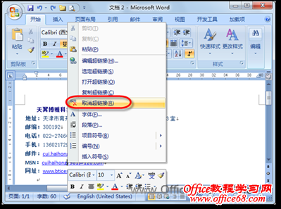 对于文档中已经存在的超链接,可以通过右键单击某个超链接,在随即打开的快捷菜单中执行【取消超链接】命令,即可取消该超链接,如图3所示。