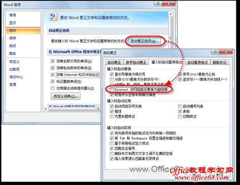 2)在对话框的“校对”选项卡中,单击【自动更正选项】按钮,然后在随即打开的“自动更正”对话框的“键入时自动套用格式”选项卡中,清除“Internet及网络路径替换为超链接”复选框,如图1所示。