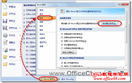 图2 在“Word选项”对话框中单击【自动更正选项】按钮 (3)在打开的“自动更正”对话框的“自动更正”选项卡中,先前选中的公司信息文本内容自动显示在了“替换为”文本框中,此时只需在“替换”文本框中输入要替换的文本内容,如“公司信息”,其他选项保持默认,然后单击【添加】按钮,将其添加到下方的列表框中即可,如图3所示。