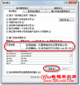 图3 在“自动更正”对话框中添加自动更正选项 (4)连续单击【确定】按钮,关闭所有对话框,自动更正选项设置完成。以后凡是在文档中需要输入该公司的详细信息时,直接输入“公司信息”这4个字,系统即可快速将其替换为对应的详细信息,如图4所示。