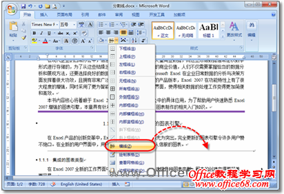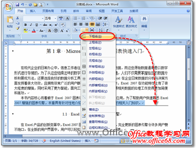 使用Word编辑文档时,可能为了使某些内容醒目显示,或者为了使文档内容显示的更美观、更有层次感,需要为文档添加一些分割线。在Word 2007中,如果能够掌握一些绘制分割线的小技巧,可以帮助用户快速美化文档,达到事半功倍的效果。 1、添加下框线 如果要在Word文档的段落之间添加分割线,可先选中整个段落或段落的最后一行,然后在“开始”选项卡的“段落”选项组中,单击【边框和底纹】的下三角按钮,在随即打开的下拉列表中,执行【下框线】命令,即可在段落下方添加一条分割线,如图1所示。