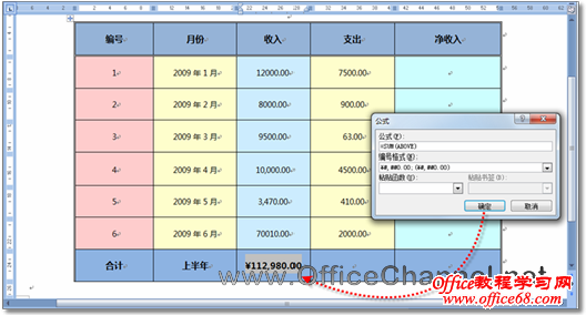 2)在此对话框中可以看到,“公式”文本框中自动输入了计算“收入”列总和的公式“=SUM(ABOVE)”,我们还可以在“编号格式”下拉列表框中设置其格式。设置完成后,单击【确定】按钮,即可得到统计的结果,如图3所示。