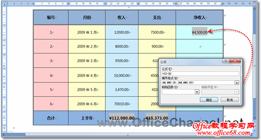 3)我们不仅可以让Word自动插入公式,而且还可以通过手工输入单元格的引用,来对表中的数据进行计算。例如,在计算1月份的净收入时,可以使用公式“C2-D2”计算1月份收入与支出之差,如图4所示。