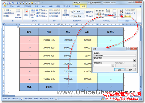 1)将光标置于需要输入“收入”列求和结果的单元格,即“收入”列最后一个单元格,在“布局”上下文选项卡的“数据”选项组中,单击【公式】按钮,打开“公式”对话框,如图2所示。