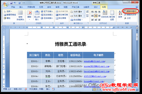 为了使表格标题显示在所有页面中,可以单击表格中任意位置,在“布局”上下文选项卡的“数据”选项组中,单击【重复标题行】按钮即可(如图2所示),设置完成后的效果如图3所示。