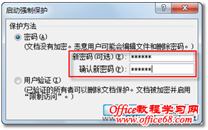 4. 在随即打开的“启动强制保护”对话框中,选中“密码”单选按钮,并在“新密码”文本框中输入密码,在“确认新密码”文本框中再次输入密码,最后,单击【确定】按钮,如4所示。