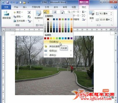 在网上下载的Word文档中的图片,每一张图片都有一个黑黑的边框,看起来十分不好看,如何使用Word2010去掉图片的边框,设置图片的边框为无轮廓呢? 操作方法: 1、鼠标单击选中图片。 2、【图片工具】【图片边框】,弹出图片边框下拉菜单。 3、在图片边框下拉菜单中,单击【无轮廓】,取消图片边框。 ![]() |
