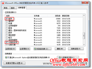 图2 启动输入选项对话框 2. 切换到“词典管理”选项卡,在“已安装词典”列表框选中“医学”和“计算机科学”复选框,单【确定】按钮完成词典设置,如图3所示。