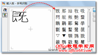 图3 手写输入 4. 从右侧自动识别出的字形中,查找到自己想要的汉字,将鼠标指向该汉字时,还可以看到它的读音,便于学习和记忆。单击该字,即可将其输入到文档中,如图4所示。