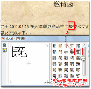 图4 自动识别汉字 小黄虽然只记得字体的一部分,但微软拼音输入法提供的强大的手写识别功能,可以根据汉字的偏旁或部首,自动识别出完整的字形,即神奇又很实用,为小黄解决了一大难题。 在邀请函文档中输入完所需的具体会议信息后,接下来,小黄需要在邀请函中加入客户信息 |