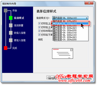 图2 信封制作指导 3. 在“选择信封样式”页面中,选择一种与实际信封尺寸相一致的信封样式,如“国内信封-DL(220×110)”,其他选项保留默认值,继续单击【下一步】按钮,如图3所示。