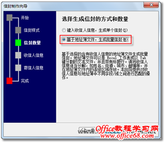 图3 选择信封样式 4. 在“选择生成信封的方式和数量”页面,选中“基于地址簿文件,生成批量信封”单选按钮,然后单击【下一步】按钮,如图4所示。