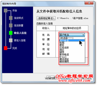 图7 地址簿文件 8. 返回到“信封制作向导”对话框,单击“姓名”右侧的“未选择”下三角按钮,在随即打开的下拉列表中选择“客户姓名”选项,如图8所示。