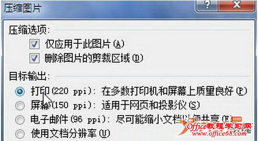 3、打开“压缩图片”对话框,选中“仅应用于所选图片”复选框,并根据需要更改分辨率。