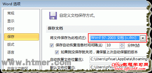 我们知道Word2010默认保存文件的格式为docx,这种文件格式只有在Word2007和Word2010中才能打开,可是现在大多数朋友还是使用的Word2003,甚至还有朋友在使用Word2000,那么在这些版本的Word中就无法打开docx文件了,如果一定要打开还要安装补丁,非常麻烦。所以如果你正在使用Word2010或2007版本,在保存文件的时候请尽量使用doc文件,这样在其他版本的Word中就可以顺利打开了。废话不多说,下面介绍Word2010设置默认保存文件格式为doc的方法。 1、首先打开Word2010,点击“文件"菜单→点击“选项” 2、在弹出的选项窗口中,在左边点击“保存”,然后在右边的窗口中,将“将文件保存为此格式”设置为“Word97-2003文档(*.doc)”即可,相关截图如下所示: