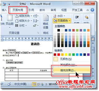 1. 在邀请函文档中,切换到“页面布局”选项卡,在“页面背景”选项组中单击“页面颜色”下三角按钮,在随即打开的下拉列表中执行【填充效果】命令,如7所示。