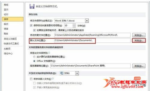 Word 2010的默认文件保存位置是C:\Users\Administrator\Documents,不过,如果任由大量文档在c盘保存,c盘空间会越来越小,最终影响电脑的性能,所以,我们就需要更改Word 2010的文档默认保存路径。 1、启动Word 2010 。 2、单击【文件】【选项】,打开Word选项窗口。 3、单击Word选项中的【保存】选项卡,接着单击默认文件位置旁边的【浏览】按钮。 ![]() 4、在弹出的窗口中选择保存目录,选好后单击【确定】。 |