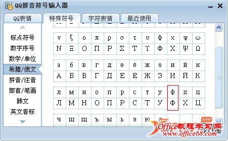 2、打开输入法的符号编辑器后,单击【特殊符号】选项卡,选择【希腊/俄文】,就可以看到直径的符号了。