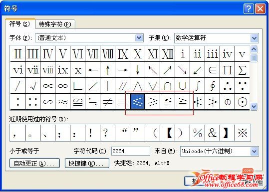 使用Word制作数学试卷的时候,数学系的朋友写作业和论文的时候,在Word中输入小于等于或和大于等于号是一定的,在英文输入法的状态下,我们可以直接在键盘上直接输入小于号和大于号,不过,小于等于或和大于等于号应该怎么打呢? 和前面小编为大家介绍的摄氏度、人民币、直径等符号一样,我们可以在Word中通过插入特殊符号的方法、利用输入法插入特殊符号的方法来在Word中输入小于等于号和大于等于号,同时,还可以使用前面向大家介绍过的Word公式编辑器来在Word中插入特殊符号。 直接在Word中插入 操作还是非常简单的,无论您是使用哪一版本的Word,只要单击【插入】【符号】,在“子集”中选择“数学运算符”,然后就可以看到小于等于号和大于等于号了。 ![]() 利用输入法插入 通过使用QQ输入法、搜狗输入法等智能输入法,也可以在Word中插入特殊符号,以QQ输入法为例,可以键盘单击【i】【1】,或者鼠标右键单击输入法图标找到特殊符号。 ![]() 利用Word公式编辑器插入 使用Word公式编辑器,也可以在Word中插入特殊字符,安装了公式编辑器后,会在Word中新增一个按钮,到时候单击那个按钮就可以了。 在Word中输入小于等于号和大于等于号可能出现的问题 1、小于等于号那个横杠应该是横的还是斜的? 小于等于号那个横杠应该是斜着的,不过看具体的需要啦,Word中两种形式都有。 2、使用公式编辑器打出来的小于等于号变形了怎么办? 检查您的公式编辑器中有关数学字体的设置是否有问题,单击【样式】【定义】,看到公式编辑器关于字体的设置,特别注意“变量”和“小写希腊字母”还有“符号”这三项的设置,如果这里是您的系统不支持的字体,那么公式编辑器是不能正确显示数学公式的,最简单的办法是点右边的“工厂设定”把它恢复为默认设置。 |