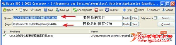 Word 2003是无法打开.docx文档的,但是我们可以把docx转成doc格式,然后就可以用Word 2003打开了,今天小编来为大家介绍一款docx转doc转换器,使用它可以实现批量转换docx格式到doc,我们就再也就用苦恼文档多了。 软件名称:Batch DOCX to DOC Converter 软件截图: ![]() 安装须知: 安装后,会自动进行升级,取消升级,然后将doc2doc.exe复制到软件的安装目录内覆盖原文件即可。 使用方法: 1、运行Batch DOCX to DOC Converter,单击Source栏右端的Folder按钮,找到并选定需要转换的DOCX文档所在的文件夹,然后单击Search按钮,批量添加docx文件。 2、单击Target栏右端的Folder按钮,弹出浏览文件夹窗口,选择转换后的doc格式文件的保存目录。 3、单击Convert按钮,该程序将自动开始批量转换文件格式,并将转换后的文件存入指定的文件夹。 |