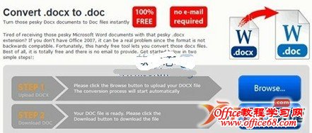 是不是不知道.docx文件怎么打开?使用的是Word 2003,打不开docx,为了解决这个问题,刚刚找了在线docx转doc的网站,发现有个在线的工具不错,在这里和大家分享一下。 在线docx转doc工具:http://www.doc.investintech.com/ 转换教程: 1、打开该在线工具的主页面,把主页面往下拉,我们会看到在线转换界面的主要操作区,如下图所示: ![]() 2、如上图所示,点击“Browse..”选择需要转换的DOCX文件; 3、当文件上传完成和转换完成之后,主操作界面会增加一个“Download”按钮,点击“Download”按钮就能下载转换好的DOC文件了。