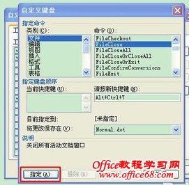 3、将光标移至“请按新快捷键”下面的空格内,设置快捷键,然后单击【指定】。