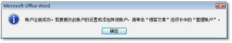 6)选中“记住机密字”复选框,这样在发布博客文章的时候就免除了多次输入“空间名称”和“机密字”的繁琐,当然出于安全考虑您可以清除该复选框。然后,连续单击【确定】按钮,完成账户注册的相关设置,此时将会收到Word 2007给出的提示信息,告知账户注册成功,如图6所示。