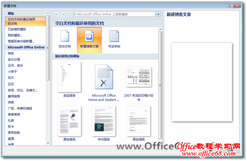 1)打开Word 2007应用程序,单击“Office 按钮”,然后执行【新建】命令,在随后打开的“新建文档”对话框中双击“新建博客文档”如图1所示。