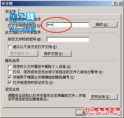 2 在弹出的“选项”窗口中进入“安全性”,然后在“打开文件时的密码”中设置密码,单击确定后重复输入一次密码,最后将文档保存一下就设置完成了。