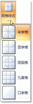 图3 在Word 2007创建的字帖 (6)在“书法”功能组中单击【网格样式】按钮,在其下拉列表中显示了Word 2007提供的“米字格”、“田字格”、“田回格”、“九宫格”和“口字格”5种不同的网格样式,如图4所示。用户可以根据个人的喜好,选择适合自己的网格样式。