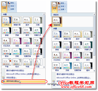 图3 保存自定义主题字体 (6)单击“主题”选项组中的【主题】按钮,执行【保存当前主题】命令。保存后,再次单击【主题】按钮时会看到自定义的主题,如图4所示。