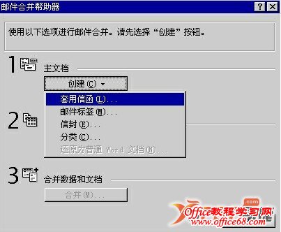 5、使用邮件合并功能合并为不同类型的文档:使用邮件合并功能不仅可以建立信函,还可以直接建立信封,邮件标签、分类等;单击“邮件合并帮助器”对话框的“创建”按钮,从弹出的菜单中选择相应的命令就可以了;如果想取消主文档的设置,就从这个菜单中选择“还原为普通WORD文档”命令。