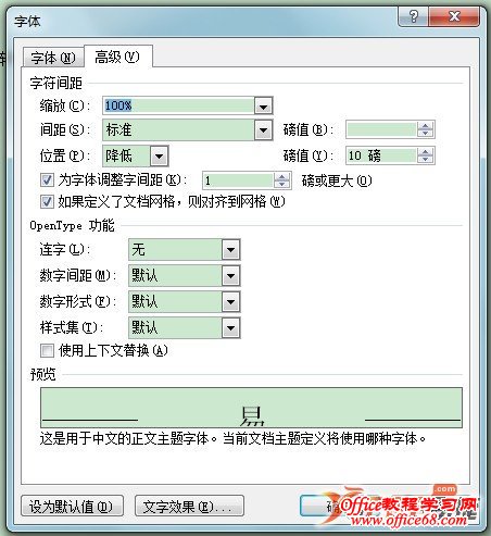 3、切换到【高级】选项卡,在“位置”后的下拉列表中,选择“降低”选项,并在后面的“磅值”框中输入一个数字,确定返回。一般情况下,10磅左右就足够了。